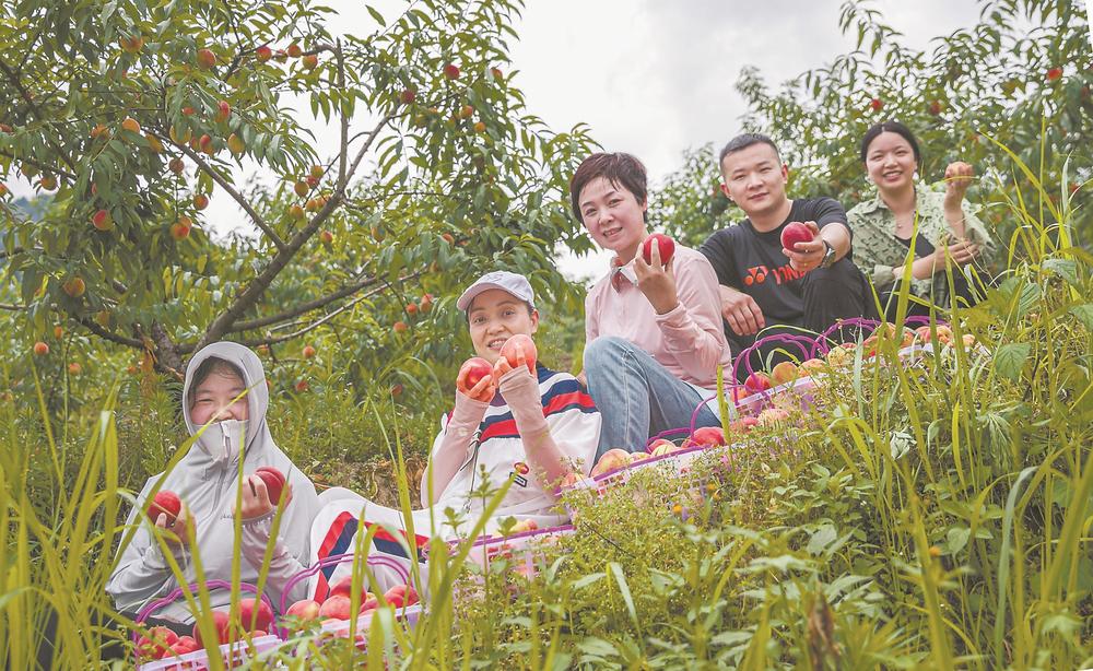 圖為游客在挑選、展示采摘的鮮桃。