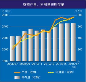 糧農(nóng)組織對2017年度末全球谷物庫存量的預(yù)報數(shù)提高了250萬噸,達(dá)到近6.62億噸,比已經(jīng)處于高位的期初庫存水平提高0.6%,再創(chuàng)記錄。這次調(diào)整反映了本月小麥生產(chǎn)前景改善以及粗糧利用量從10月份報告的水平上少量下調(diào)。據(jù)最新預(yù)報,2016/17年世界谷物庫存量與利用量之比將為25.3%,大大高于2007/08年出現(xiàn)的20.5%的歷史最低水平,但要比30年前(1986/87年)創(chuàng)下的35.6%的記錄低得多。2016/17年全球小麥庫存估計將增加4%(900萬噸),達(dá)到2.35億噸,其中大部分增長出現(xiàn)在中國、美國和俄羅斯聯(lián)邦。相反,世界粗糧庫存量現(xiàn)預(yù)測為近2.57億噸,比其期初水平低1.7%(430萬噸),中國、巴西和南非的下降完全抵消了其他一些國家尤其美國出現(xiàn)的增長。2016/17年度末世界大米庫存量同樣預(yù)報將下降,但僅僅微弱下降,降至1.699億噸,因為預(yù)期印度和泰國動用庫存出現(xiàn)的下降,將基本上為其他國家尤其是中國庫存的積累所抵消。