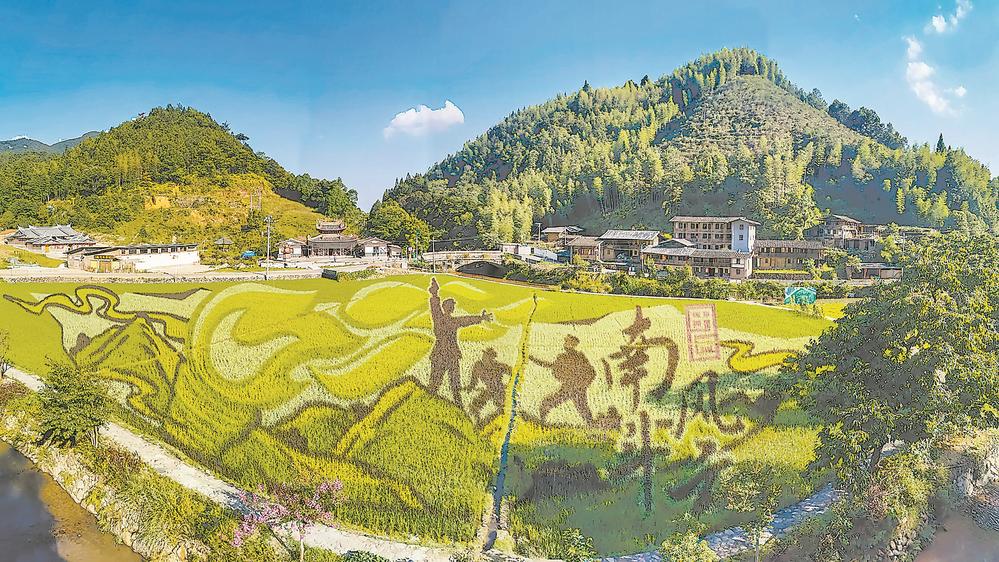 近日,泉州市德化縣國寶鄉(xiāng)南斗村以田為紙、以稻為筆,繪就了“南斗風云”紅色主題3D稻田畫,以此銘記革命先輩英勇戰(zhàn)斗的“戴云精神”。畫卷主體為戰(zhàn)士腳踏戴云山脈,突破重圍,英勇戰(zhàn)斗,融入戴云山景色,并以“南斗風云”四字點題。