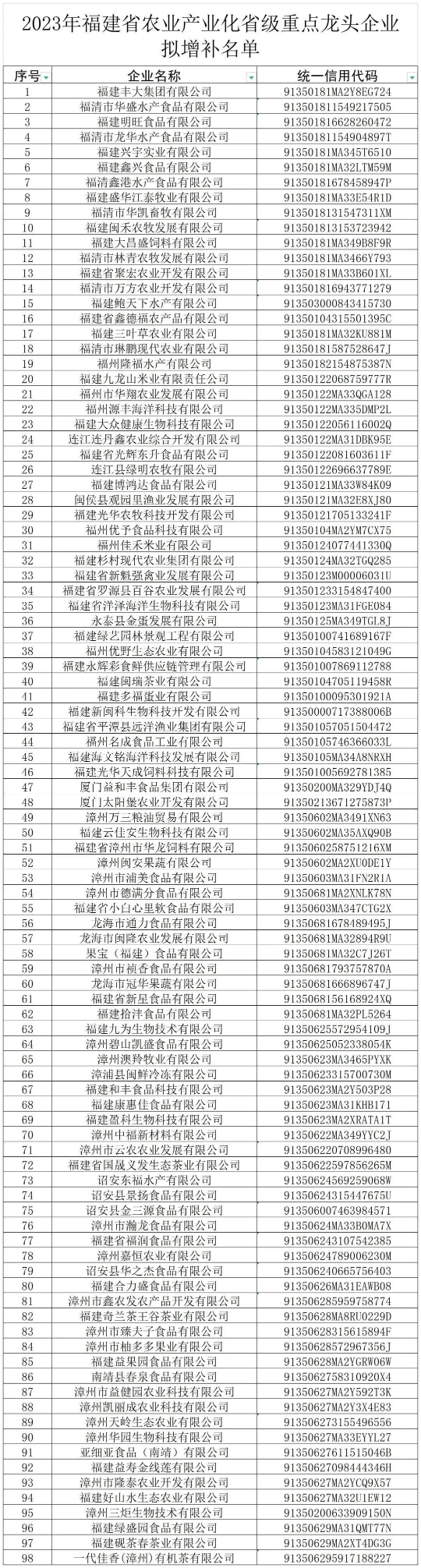 2023年擬增補福建省農(nóng)業(yè)產(chǎn)業(yè)化省級重點龍頭企業(yè)名單的公示