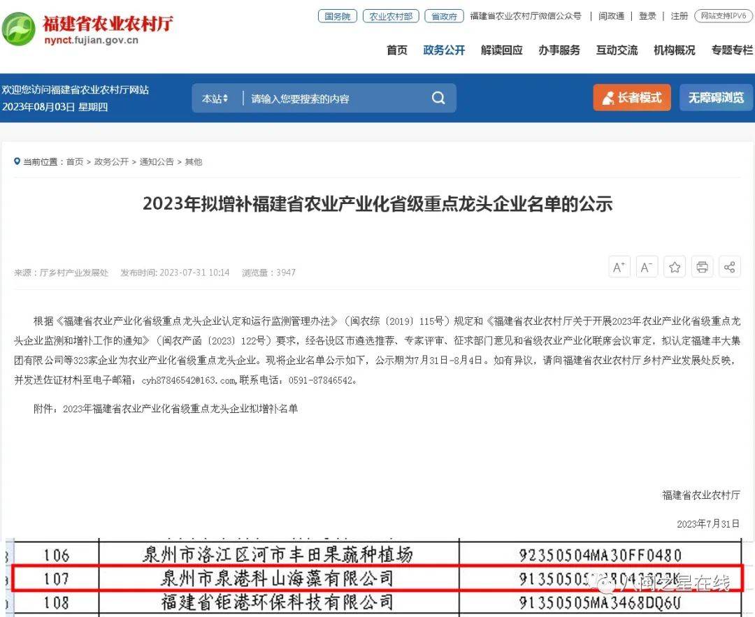 日前,根據(jù)《福建省農(nóng)業(yè)產(chǎn)業(yè)化省級重點龍頭企業(yè)認(rèn)定和運行監(jiān)測管理辦法》(閩農(nóng)綜〔2019〕115號)規(guī)定和《福建省農(nóng)業(yè)農(nóng)村廳關(guān)于開展2023年農(nóng)業(yè)產(chǎn)業(yè)化省級重點龍頭企業(yè)監(jiān)測和增補工作的通知》(閩農(nóng)產(chǎn)函〔2023〕122號)要求,經(jīng)各設(shè)區(qū)市遴選推薦、專家評審、征求部門意見和省級農(nóng)業(yè)產(chǎn)業(yè)化聯(lián)席會議審定,福建省農(nóng)業(yè)農(nóng)村廳發(fā)布2023年福建省農(nóng)業(yè)產(chǎn)業(yè)化省級重點龍頭企業(yè)公示名單。泉州市泉港科山海藻有限公司成功入選 農(nóng)業(yè)產(chǎn)業(yè)化省級重點龍頭企業(yè)公示名單。這是政府有關(guān)部門對科山海藻取得成績的充分肯定,為公司未來發(fā)展奠定堅實的基礎(chǔ)。