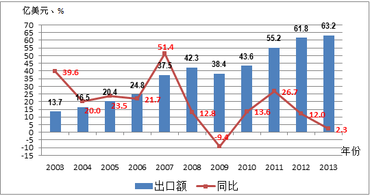 近10年來,我國水果出口額呈增長態(tài)勢,由2003年的13.7億美元增加到2013年的63.2億美元,年均增長16.5%。其中,前5年年均增長25.3%;2008年以來年均增長8.4%,主要是鮮果出口的增長,加工水果中果汁出口下降,罐頭等小幅增長(圖1)。