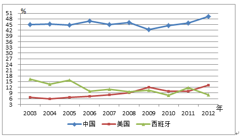據(jù)聯(lián)合國Comtrade數(shù)據(jù),2012年我國水果出口額低于美國、西班牙、荷蘭,排名第四。其中,鮮蘋果、蘋果汁、柑桔罐頭出口均排名第一,占全球出口比例分別為13.3%、40.1%、49.2%(圖6、圖7、圖8)。