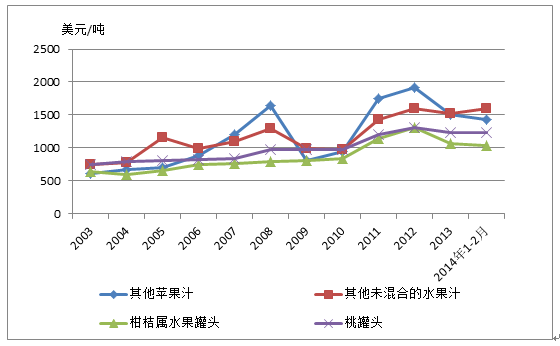 圖9 2003-2014年我國部分加工水果出口均價變化