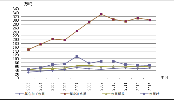 從出口量看,前期快速增長,金融危機以來呈下降趨勢。鮮冷凍水果出口由2003年的148.8萬噸增至2009年的332.6萬噸,此后降至300萬噸左右,2013年為303.2萬噸,略高于2008年的出口水平;果汁、罐頭出口量變化情況與鮮冷凍水果相似,2013年分別為66.8萬噸和61.6萬噸,分別低于2005年和2007年的出口水平(圖2)。