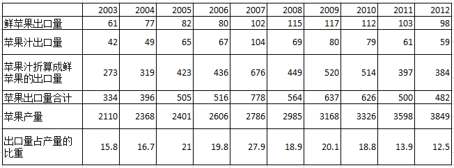 表1 2003-2012年我國蘋果生產(chǎn)及出口變化