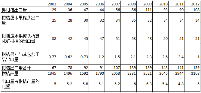 表22003-2012年我國柑桔生產(chǎn)及出口變化