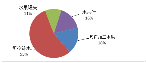 我國鮮冷凍水果出口以蘋果、柑桔、梨等溫帶水果為主,2013年出口35億美元,占水果出口總額的55.4%,比2003年的36.6%提高了18.8個百分點;加工水果以蘋果等果汁和柑桔等罐頭為主,2013年出口10.1億美元和6.9億美元,分別占水果出口總額的16.1%和10.9%,低于2003年的20.4%和19.7%(圖3)。