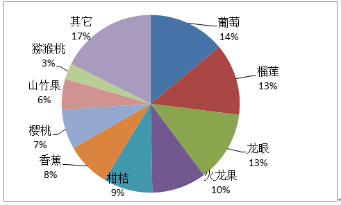我國水果進口以鮮冷凍水果為主,2013年占進口總額的86.9%,高于2003年的75.5%。進口的鮮冷凍水果中以熱帶水果為主,2013年主要進口葡萄、榴蓮、龍眼、火龍果、柑桔、香蕉、櫻桃、山竹果、獼猴桃等(圖4)。進口的加工水果有冷凍橙汁、桃罐頭、菠蘿罐頭等。
