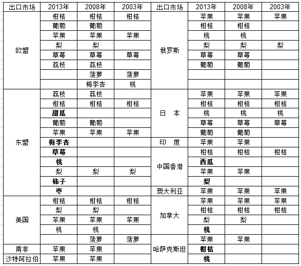 2013年,我國水果出口前五大市場是美國、日本、泰國、馬來西亞和越南,分別占水果出口總額的16.3%、10.9%、10.2%、7.9%、7.6%,合計占52.9%。其中,鮮冷凍水果出口以東盟、俄羅斯、印度等周邊發(fā)展中貿(mào)易伙伴為主,加工水果以美國、日本等發(fā)達國家為主(圖5、表3)。