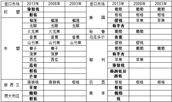 表4近年進口額超過1000萬美元的來源地及水果品種