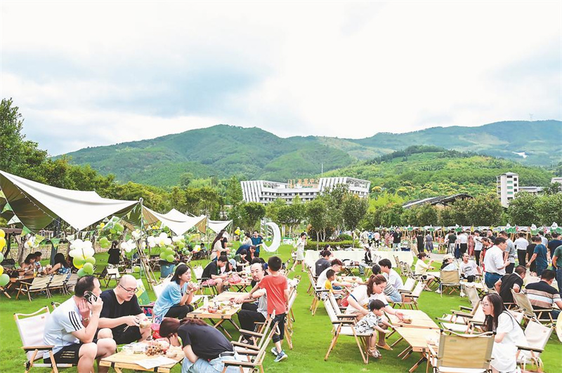 25日下午,2023年“福建供銷(xiāo)后備箱經(jīng)濟(jì)?助力鄉(xiāng)村振興”活動(dòng)(第3場(chǎng))啟動(dòng)儀式在福州市閩清縣東橋鎮(zhèn)九野小鎮(zhèn)舉行,現(xiàn)場(chǎng)推出了后備箱集市、鄉(xiāng)村音樂(lè)節(jié)、非遺手作體驗(yàn)、農(nóng)事體驗(yàn)等活動(dòng)?,F(xiàn)場(chǎng)設(shè)有30個(gè)攤位,展品包含閩清特色農(nóng)副產(chǎn)品、民俗產(chǎn)品、旅游衍生文創(chuàng)周邊產(chǎn)品、特色旅游線(xiàn)路套票、非遺小吃等。圖為游客在主辦方設(shè)置的帳篷咖啡區(qū)體驗(yàn)新型鄉(xiāng)野休閑方式。