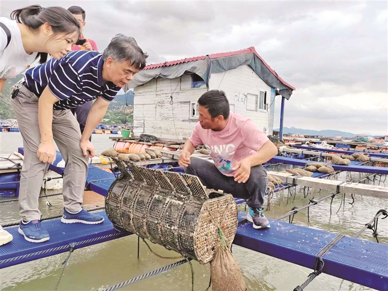 寧德市再擔(dān)保公司工作人員察看寒垅村鮑魚養(yǎng)殖情況 劉陽 攝