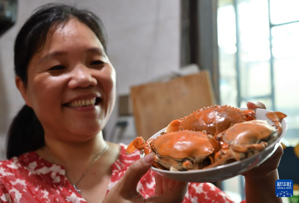 浮曦村村民甘淑芳展示一盤蒸熟的紅蟳。新華社記者 魏培全 攝