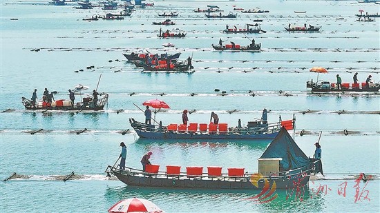 每年白露過后,南日紫菜便進入潑苗時節(jié)。近日,在莆田市秀嶼區(qū)南日鎮(zhèn)三墩、西高海域上,養(yǎng)殖戶們乘著漁舟在海面上來回穿梭,不斷地將紫菜苗灑向養(yǎng)殖排,讓紫菜苗“落地生根”,一派繁忙景象(如圖)。