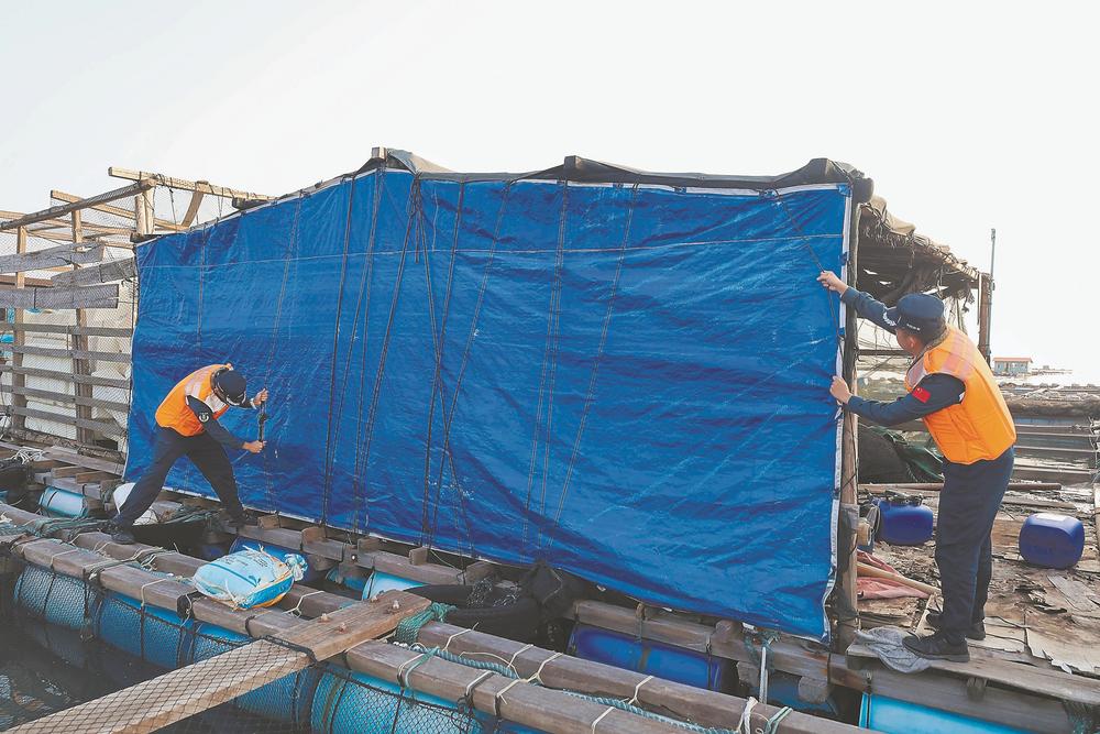 今年第14號臺風“小犬”于5日8時20分前后以強臺風級在臺灣省屏東縣鵝鑾鼻登陸,登陸后減弱西行。作為秋臺風,“小犬”給我省帶來風雨影響,尤其在風的方面較為突出。日前,漳州海警局執(zhí)法員赴轄區(qū)各重點海域,開展防臺風宣傳和安全檢查。圖為漳州海警執(zhí)法員在幫助漁民固定漁排天遮。