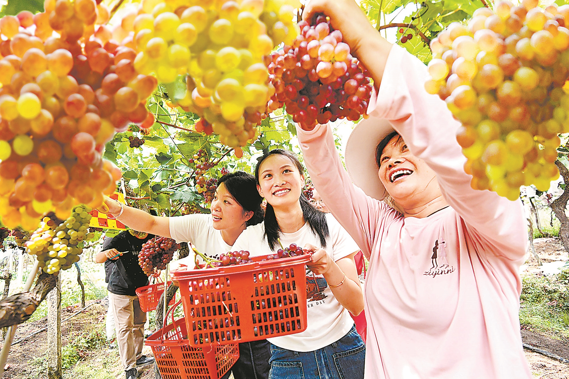 中秋國慶假期,在周寧縣浦源鎮(zhèn)悠然農(nóng)民專業(yè)合作社葡萄種植大棚,一串串顆粒飽滿的“紅寶石”葡萄掛滿枝藤,吸引了不少游客前來采摘。(記者 林輝 通訊員 鄭文敏 劉志瑋 攝)