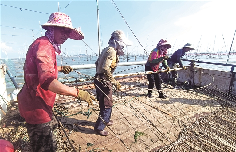 國慶長假期間,寧德市霞浦縣三沙鎮(zhèn)古桶村紫菜養(yǎng)殖科技示范基地里仍呈現(xiàn)一派繁忙的景象,紫菜養(yǎng)殖戶忙著為今年的紫菜分苗。