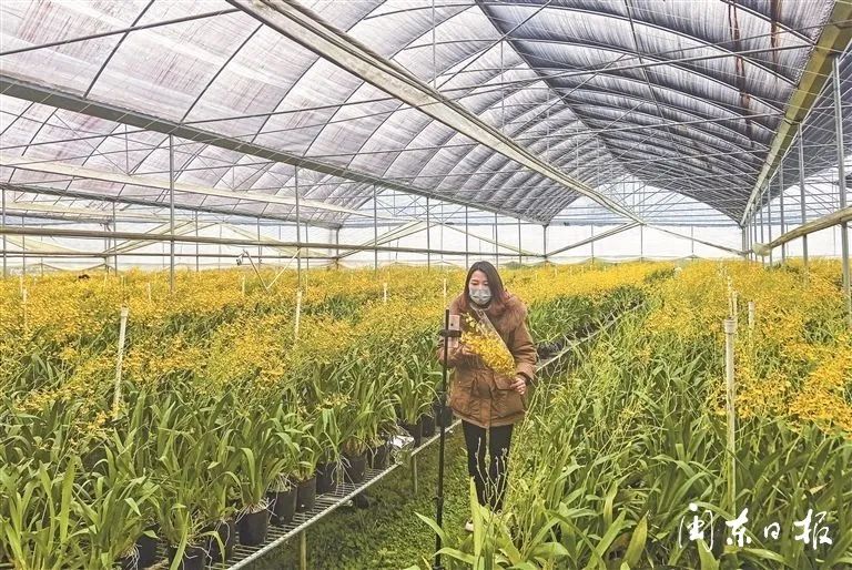 白水洋蘭花有限公司栽培大棚里,工作人員在直播帶貨