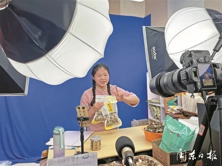 記者走進(jìn)屏南辰頤嚴(yán)選電商產(chǎn)業(yè)園,工作人員正忙著直播、確認(rèn)訂單、分揀、理貨、包裝、裝車……從辦公室到發(fā)貨倉,處處是忙碌的身影。而另一邊的主播則將直播間直接搬到了包裝車間,現(xiàn)場推介香菇、鹿茸菇等農(nóng)特產(chǎn)品。