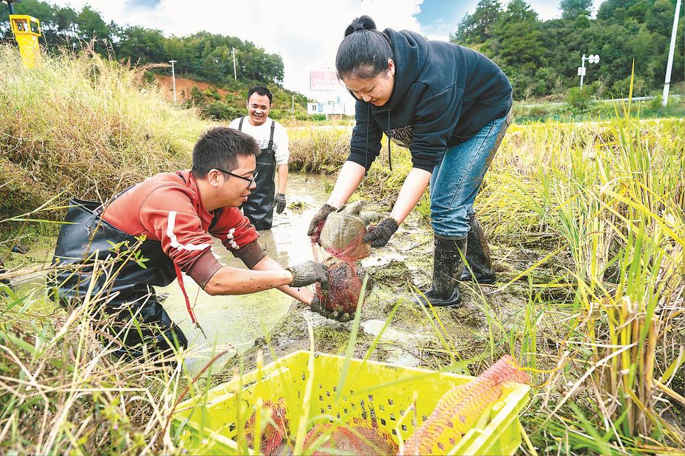 21日,在位于南平市光澤縣鸞鳳鄉(xiāng)大陂村的稻田養(yǎng)鱉項(xiàng)目田里,農(nóng)戶與游客一起將捕捉到的鱉放入網(wǎng)兜,準(zhǔn)備運(yùn)往省城水產(chǎn)市場(chǎng)銷售。