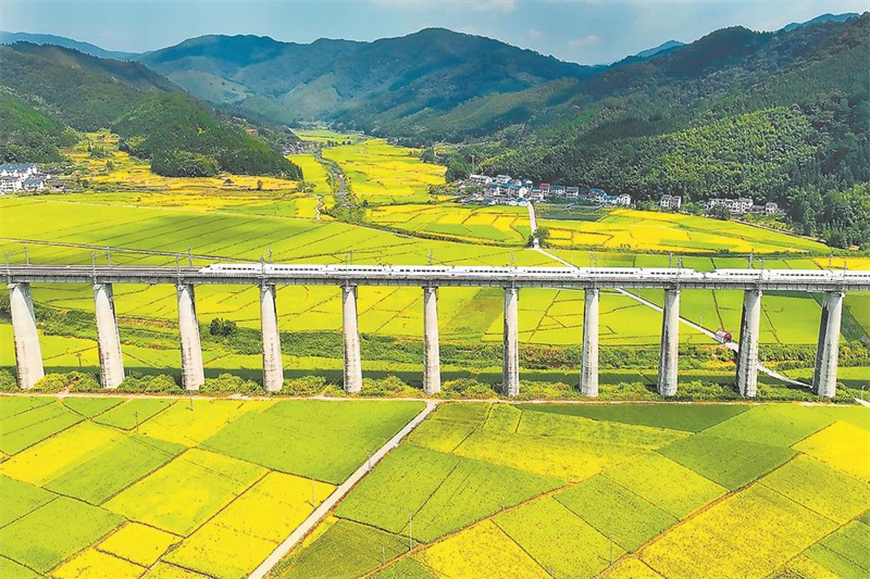 今年是向莆鐵路開(kāi)通運(yùn)營(yíng)10周年。10年來(lái),向莆鐵路由鋼鐵大動(dòng)脈化身經(jīng)濟(jì)大動(dòng)脈,串聯(lián)起武夷山、大金湖等一系列風(fēng)景名勝區(qū),為旅游注入發(fā)展新活力。據(jù)了解,2013至2023年,向莆鐵路開(kāi)行的贛閩圖定旅客列車(chē)由2013年的18對(duì)增至目前的62對(duì),總計(jì)發(fā)送旅客2.5億人次。三明是向莆鐵路設(shè)立最多車(chē)站的地區(qū),建寧、泰寧、將樂(lè)、沙縣區(qū)、尤溪等地旅游發(fā)展迅速。2022年,三明地區(qū)接待游客總?cè)藬?shù)突破3904.27萬(wàn)人次,旅游總收入308.42億元。圖為近日,動(dòng)車(chē)組列車(chē)疾馳在向莆鐵路線上。