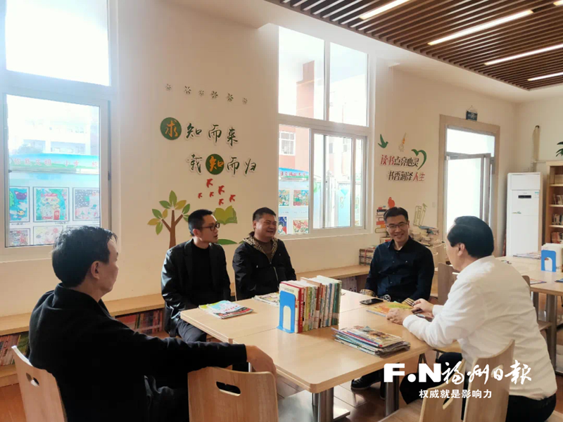 高山村鄉(xiāng)賢薛廣祥(右一)、王可興(右三)等到高山中心小學(xué)商討?yīng)劷酞剬W(xué)基金捐款事宜。 (福清市委組織部供圖)