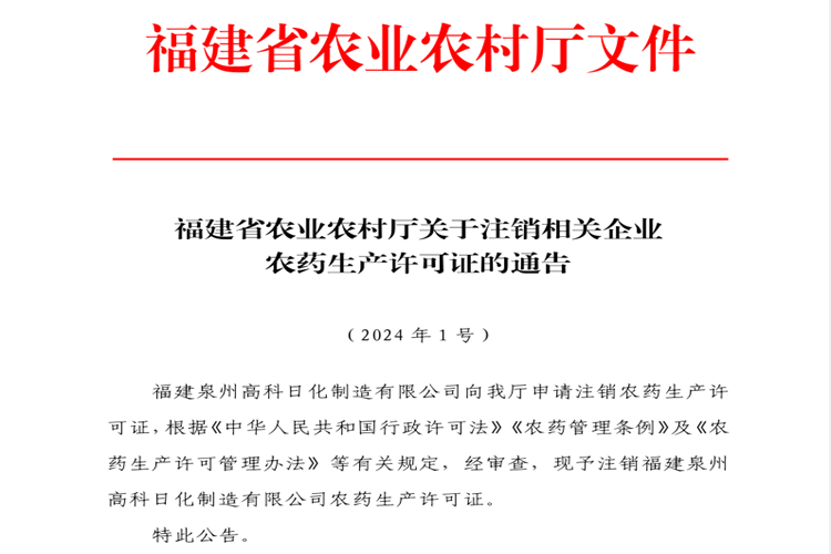 福建泉州高科日化制造有限公司向我廳申請注銷農(nóng)藥生產(chǎn)許可證,根據(jù)《中華人民共和國行政許可法》《農(nóng)藥管理條例》及《農(nóng)藥生產(chǎn)許可管理辦法》等有關規(guī)定,經(jīng)審查,現(xiàn)予注銷福建泉州高科日化制造有限公司農(nóng)藥生產(chǎn)許可證。