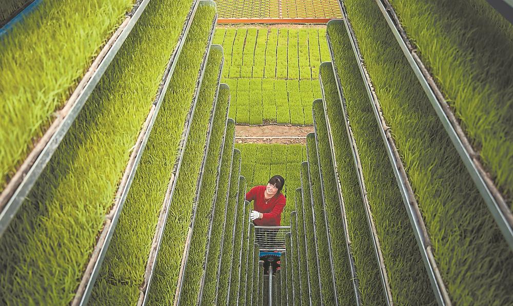 19日,南安市洪瀨鎮(zhèn)順和家庭農(nóng)場(chǎng)投入50多萬(wàn)元購(gòu)置的循環(huán)運(yùn)動(dòng)式育苗設(shè)備,開始為春耕供苗。圖為技術(shù)人員在查看育苗設(shè)備上秧苗長(zhǎng)勢(shì)。