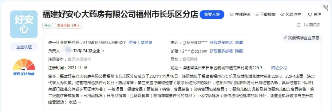 另?yè)?jù)“愛(ài)企查”顯示,福建好安心大藥房有限公司福州市長(zhǎng)樂(lè)區(qū)分店成立于2021年11月16日,注冊(cè)地位于福建省福州市長(zhǎng)樂(lè)區(qū)航城街道龍津村前街。