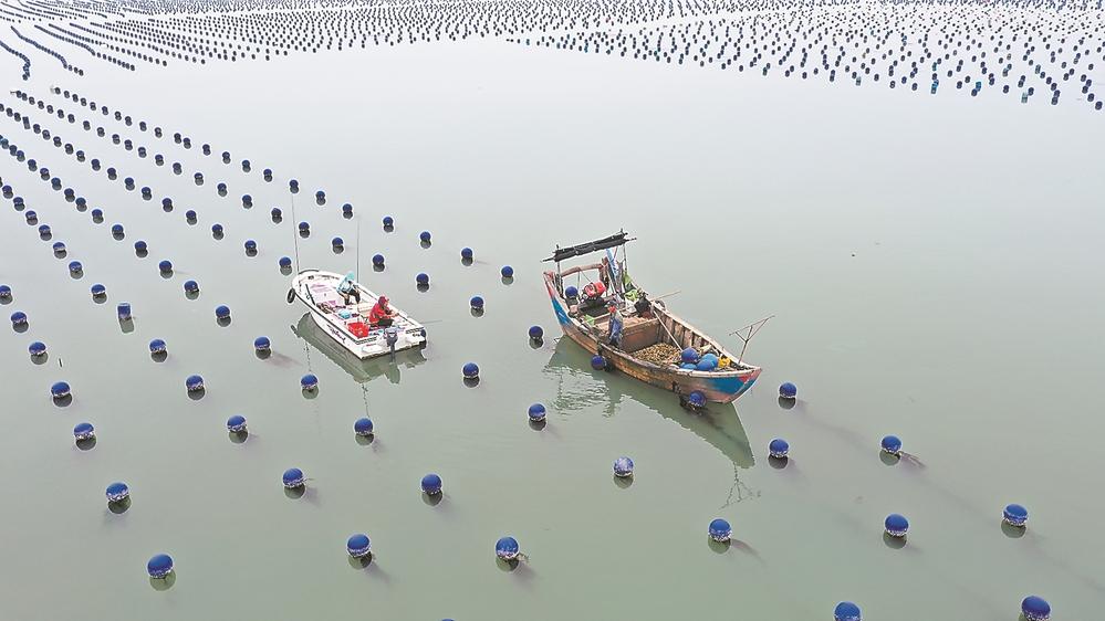 近日,在福州市連江縣定海灣海域的海洋牧場,工人在養(yǎng)殖區(qū)進(jìn)行養(yǎng)殖作業(yè),呈現(xiàn)一派海上“春耕”的繁忙景象。