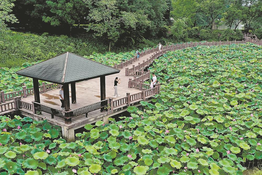 盛夏時(shí)節(jié),福州金山公園的荷花競相綻放,綠葉紅花清新雅麗,吸引了不少游客前來賞花、拍照。圖為15日,游客在福州金山公園荷塘賞荷游玩。