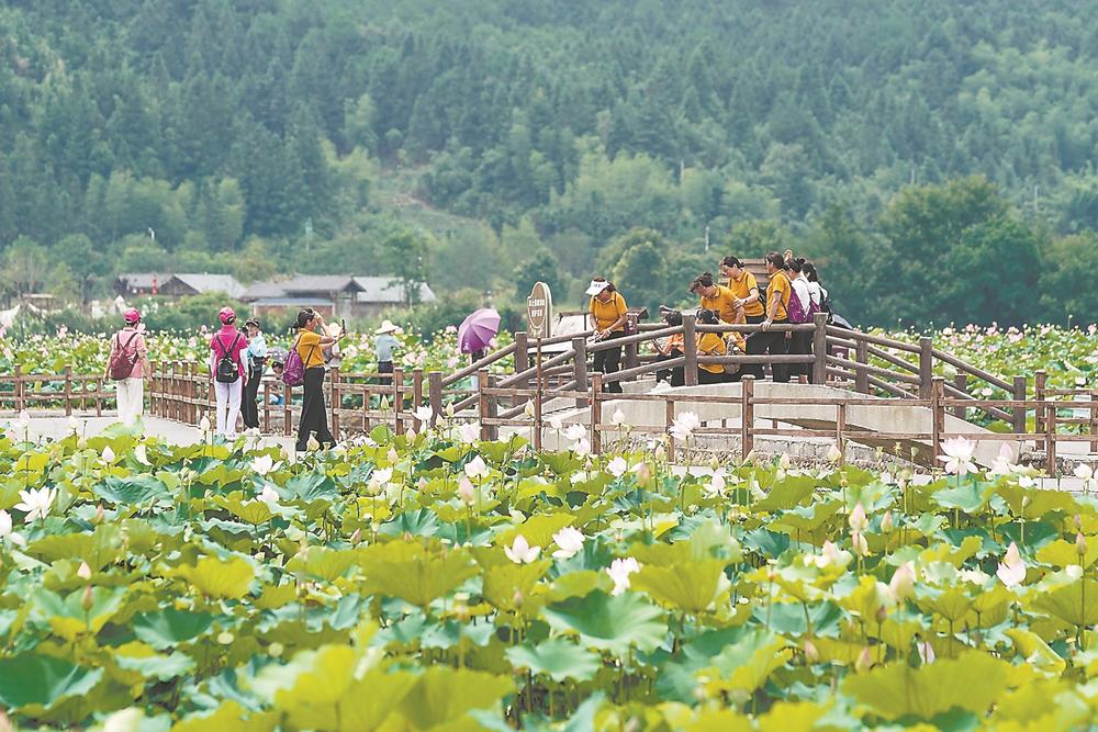 6月23日,游人在南平市武夷山市五夫鎮(zhèn)萬畝荷塘花海中游玩、留影。
