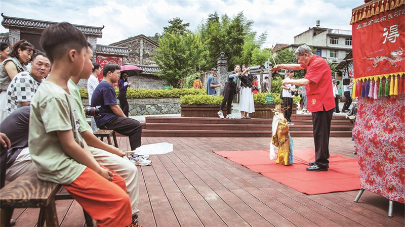 村民和游客正在觀看提線木偶戲表演。鄭育紅 攝