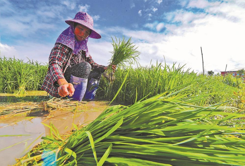 圖為近日,泉港區(qū)壩頭溪沿岸稻田里,村民忙著采收秧苗,準(zhǔn)備搶插晚稻。