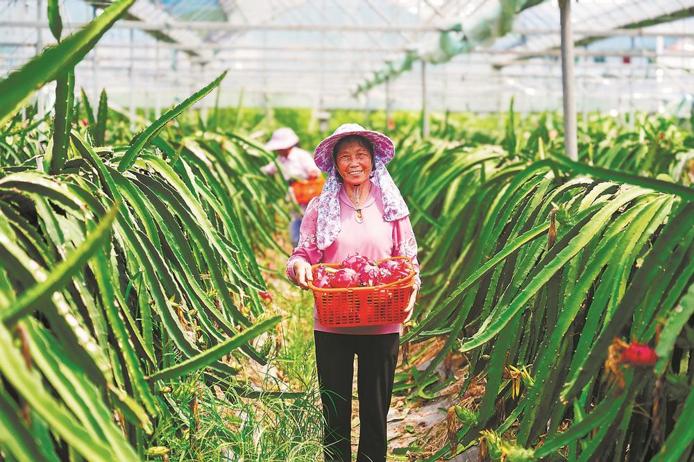 位于三明市寧化縣石壁鎮(zhèn)楊邊村的閩臺農(nóng)業(yè)融合發(fā)展基地,通過村黨支部與臺企合作共建的方式,流轉(zhuǎn)土地500畝,項目投資2000余萬元,建設(shè)臺灣現(xiàn)代水果種植示范區(qū)、農(nóng)文旅休閑生態(tài)區(qū)、產(chǎn)品展銷及直播助農(nóng)區(qū),打造農(nóng)文旅融合發(fā)展的現(xiàn)代農(nóng)業(yè)基地。據(jù)悉,今年豐收的臺灣火龍果畝產(chǎn)可達1500公斤。圖為在臺灣現(xiàn)代水果種植示范區(qū),村民在采摘臺灣火龍果。