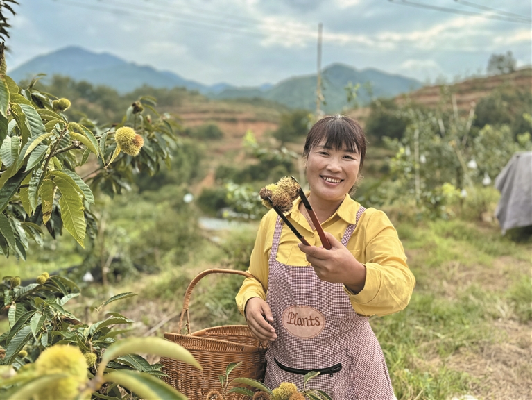 陸昌雪是遠近聞名的栗子大戶,2016年,她帶頭成立屏南縣黑栗子錐栗專業(yè)合作社,成員數(shù)量從最初的8人到如今的51人,合作社規(guī)模越來越大。2023年,合作社共售出栗子生果40萬公斤,遠銷廣州、深圳等地,帶動80余戶家庭從事錐栗生產(chǎn),并為12戶精準扶貧戶提供苗木、技術(shù)指導(dǎo),推動農(nóng)民增收,為鄉(xiāng)村振興注入強勁動“栗”。