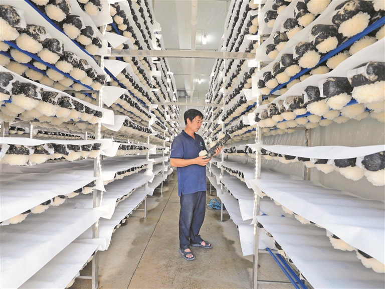 在壩頭村食用菌生產(chǎn)基地,技術(shù)管理員在察看銀耳長勢
