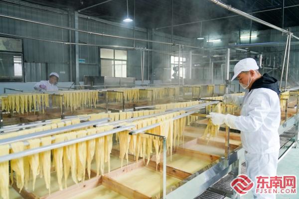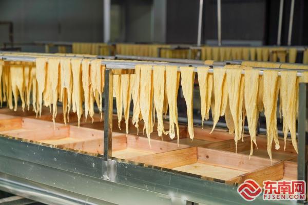 11月19日,走進(jìn)三明市泰寧縣開(kāi)善鄉(xiāng)墩上村腐竹加工廠的生產(chǎn)車(chē)間,香氣彌漫,一排排架子上掛滿了一張張淡黃色的豆腐皮。在滿室氤氳的霧氣中,加工廠負(fù)責(zé)人楊林均一邊在架子旁不停地忙碌著,一邊介紹他做豆腐皮勤勞致富的故事。