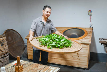 “好的茶葉香氣優(yōu)異,有蘭花香、桂花香,泡出來葉底完整。滋味醇和,有獨(dú)特蘭花香、桂花香,被譽(yù)為茶中香水?!编囬L捷介紹,為保證品質(zhì),茶葉的制作過程十分考究。鮮葉采摘后,早上六七點(diǎn)鄧長捷便開始晾曬茶青。隨后將茶青送入青房制作,這道工序共需3-4遍,每遍約2—2.5小時,往往在凌晨至第二天六七點(diǎn)進(jìn)行炒青。此后還需經(jīng)過揉捻、定型、烘烤,最終成品。
