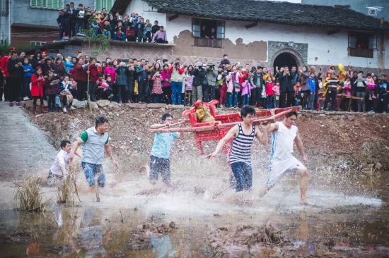 2月3日,正月初七,新春的氣息尚未散去,寧化縣石壁鎮(zhèn)陳塘村直逕里正在上演一場打“泥巴仗”鬧春田祈豐收的傳統(tǒng)廟會(huì),吸引遠(yuǎn)近上千名群眾及游客前往觀看,60多名來自省內(nèi)外的攝影愛好者提著“長槍短炮”早早蹲守在田邊等候拍攝。