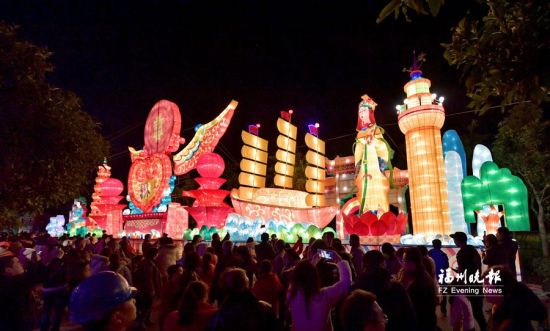 本次燈會因地制宜,設(shè)置了“吉祥中國年”“五區(qū)疊加美”“時尚新馬尾”“歷史的沉淀”“兩岸共繁榮”“歡樂新天地”六個燈區(qū)。內(nèi)透、分色裱糊等傳統(tǒng)工藝與現(xiàn)代光雕技術(shù)相結(jié)合,大型燈組氣勢恢宏、美輪美奐,彩色宮燈流光溢彩、絢麗多姿,襯以東江濱一線建筑景觀亮化,以及掩映在公園花草樹木間“形、聲、色”兼具的氛圍燈,營造出盛世歡鬧喜慶的熱烈氛圍。