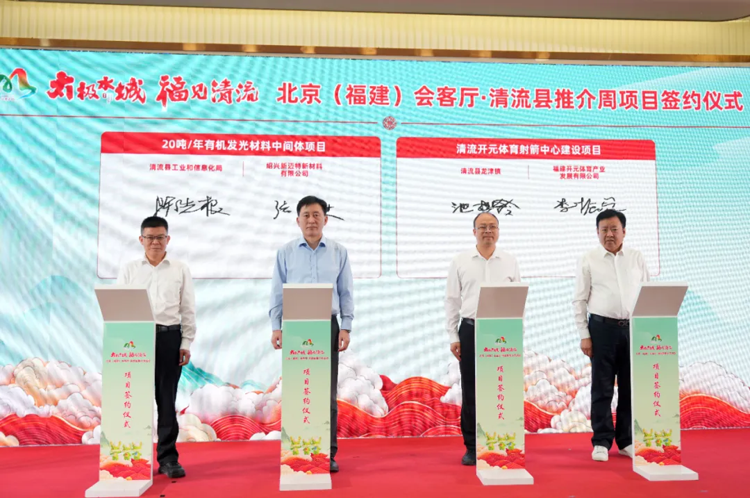 在活動(dòng)的重要環(huán)節(jié)——集中簽約儀式上,共有4個(gè)項(xiàng)目成功簽約,總金額29.2億元。項(xiàng)目涵蓋新材料、體育、智能織造、氟新材料等領(lǐng)域,分別是20噸/年有機(jī)發(fā)光材料中間體項(xiàng)目、清流開(kāi)元體育射箭中心建設(shè)項(xiàng)目、中恒經(jīng)編新材料(PE)應(yīng)用智能織造工廠項(xiàng)目、中欣高寶氟產(chǎn)業(yè)提升改造項(xiàng)目。
