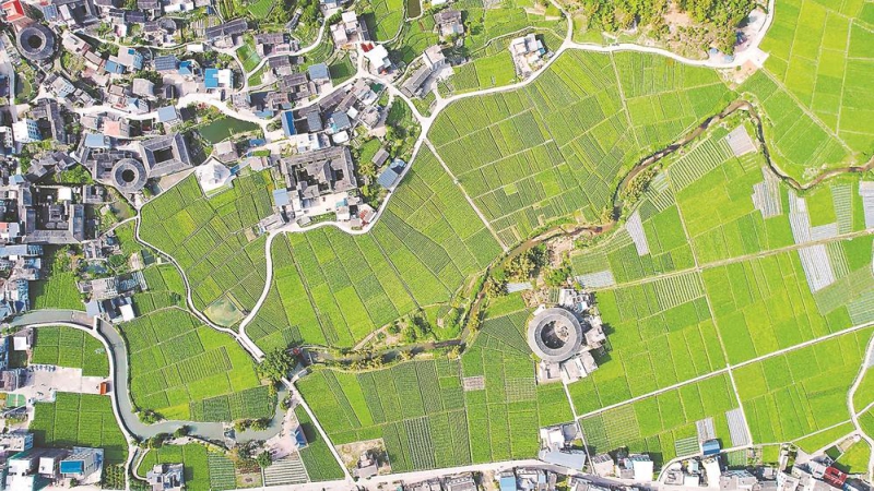 龍巖市永定區(qū)湖坑鎮(zhèn)奧杳片地處永定、南靖、平和三縣(區(qū))交界處,是福建土樓“六群四樓”的中心地帶。眼下,在碧綠的農(nóng)業(yè)種植基地間靜臥著東華樓等土樓,渾圓輪廓與縱橫阡陌相映成趣,構(gòu)成一幅美麗的鄉(xiāng)村春景畫卷。