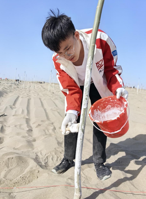 許勛壹在沙漠中給樹(shù)苗的樹(shù)干涂白